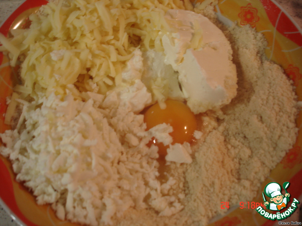 Добавить сметану, все сыры по списку, яйцо, хорошо все перемешать