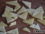 С батона срезаем корку, режем маленькими треугольниками и обжариваем на смазанной сливочным маслом сковородке.