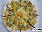 "Золотой" потому что все ингредиенты в желто-золотистой гамме. Сочетание компонентов очень вкусное и гармоничное. Если вам совсем некогда его выложить порционно в виде солнышка - можно просто сложить ингредиенты в салатнице и заправить. Но подав его как я предлагаю, вы потратите всего на 15 минут больше, но порадуете родных.