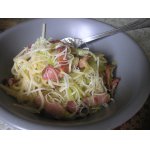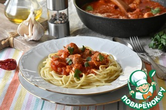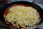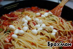 -Спагетти помещаем к соусу, добавляем рубленый чеснок.