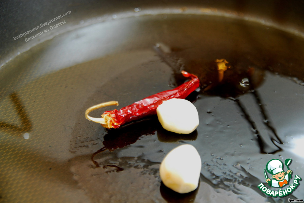 Обжарим чеснок и острый перец несколько минут, после чего отложим в сторону. -
