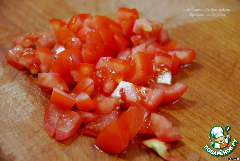 -Откроем банку с томатами в собственном соку, снимем кожуру с помидор, поместим с соком в миску и немного помнем вилкой.