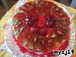Собираем торт. Сверху укладываем любые фрукты и поливаем желе для торта.