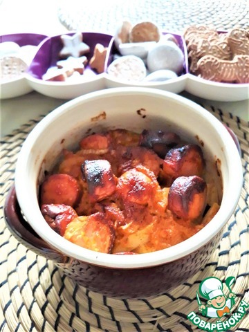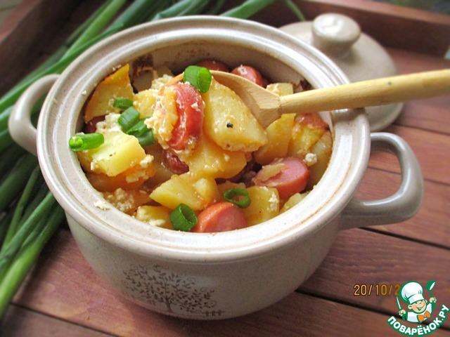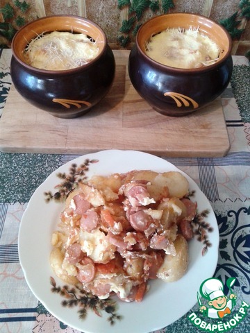 Горшочки "Sos" с сосисками)) Летом не очень хочется долго стоять у плиты, поэтому блюдо в горшочках - отличный вариант - закинул в духовку и забыл)) Подходящее блюдо для дачи или быстрого ужина.