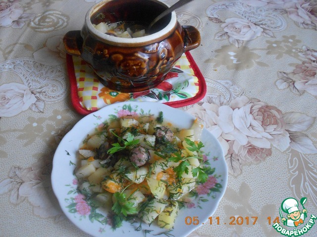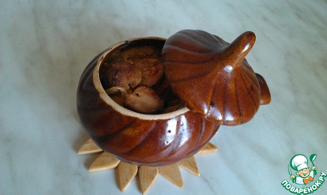 У меня один большой горшочек на две порции, поэтому я выкладываю блюдо по тарелкам :-[