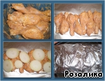 Фольгу отрываем, смазываем маслом, укладываем лук, сверху куриные ножки, на них кольца лука. Заворачиваем и укладываем на противень. Выпекаем при 200*С около часа. -