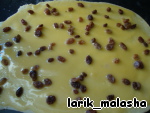 Раскатать тесто в прямоугольник, намазать кремом, добавить вымоченный изюм.