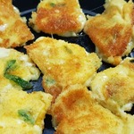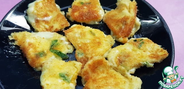 Окунаем сыр в яйца с зеленью (туда, кстати, можно добавить немного нарезанного чеснока), далее хорошо обваливаем в сухарях и кладем на хорошо разогретую сковороду с маслом.