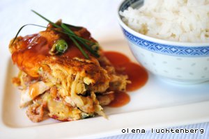 Экс-китайский омлет под кисло-сладким соусом. Когда-то давно было это блюдо воистину китайским, но со временем изменилось, чтобы подойти по вкусу Европе и Америке. Тем не менее, этот омлет с курицей, креветками и овощами очень хорош, прост и вкусен и станет полноценным обедом или ужином с гарниром из риса. Кроме того, наполнители (мясо и овощи) можно без проблем варьировать.