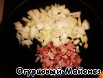 На растительном масле обжариваем мелко порубленный окорок и репчатый лук.