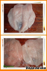 Итак: первым делом подготавливаем филешки. Если филе крупное, то разрезать его пополам. А если нет ,то как бы его режем пополам, но не до конца, и разворачиваем как книжку (на верхнем фото я так и сделала).