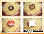 Теперь формируем наш мешочек: для этого берем филешку, кладем сверху омлет. В центр уложить шампиньон (шляпку). Теперь сверху кладем немного обжаренных грибов (это наши ножки), кусочек помидора и кусочек сыра.