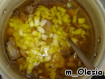 Добавляем в кастрюлю лук. Не перемешиваем. Тушим на небольшом огне около 10 минут.