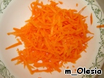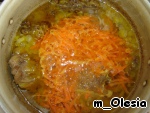 К куриному мясу и луку добавляем морковь. Не перемешиваем. Варим на медленном огне около 10 минут.