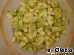 В кастрюлю к куриному мясу и остальным овощам добавляем нарезанный кабачок. Не перемешиваем. Тушим на небольшом огне около 10 минут.