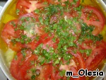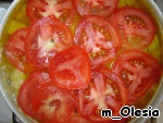 В кастрюлю к остальным продуктам добавляем помидоры. Не перемешиваем. Тушим на небольшом огне около 3 минут.