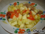 Картофель добавляем в кастрюлю к мясу и остальным овощам. Не перемешиваем. Варим на небольшом огне около 10 минут. При необходимости добавляем в кастрюлю кипяченую воду.