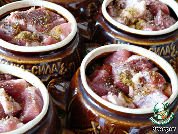 Лук мелко нарезать, засыпать на дно горшочка. -