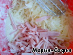 Добавить сыр и ветчину к тесту и хорошо перемешать.