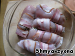 Оборачиваем каждый ленточкой бекона. Если берете фасованный порционный бекон в вакуумной упаковке, выбирайте тот, в котором больше прослоек сала, он эластичнее. Такой бекон с широкими прослойками мяса частенько ломается при обертывании.