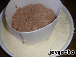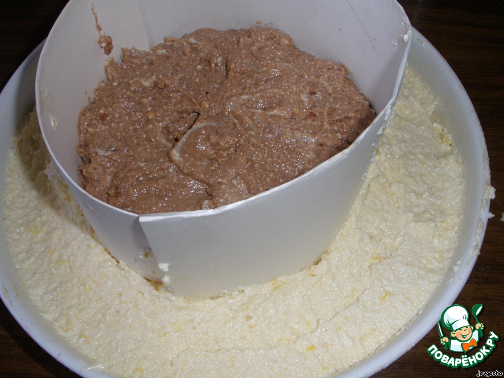 В смазанную форму поместить круг из бумаги или фольги. В центр класть массу с какао. По краю - белую массу. Круг убрать. -