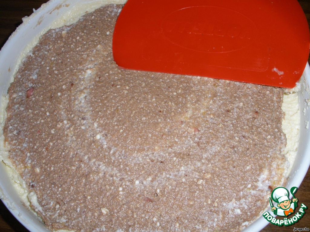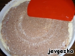 Разделить массу на две части. К одной части добавить конфеты и какао.