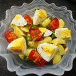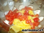 Теперь очередь петрушки. Добавляем к картофелю и помидоркам, солим, перчим, добавляем масло и перемешиваем.