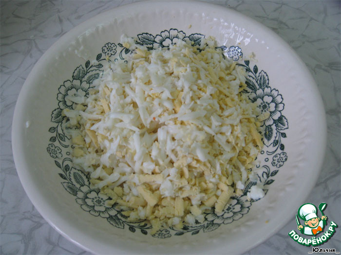 • Натираем плавленые сырки и выдавливаем к ним чеснок.