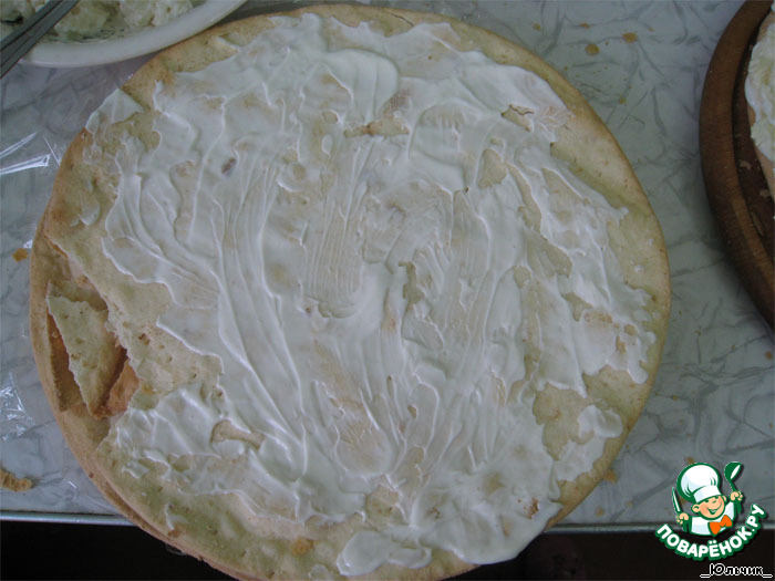 • Начинаем выкладывать начинку на коржи и формировать торт в таком порядке: