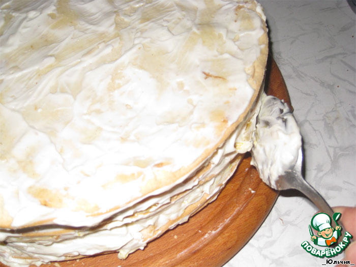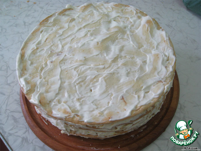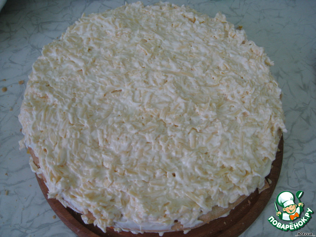 1. Лучше делать торт с вечера, чтобы он пропитался, и при готовке каждый корж дополнительно смазывать майонезом, а потом и бока торта тоже.