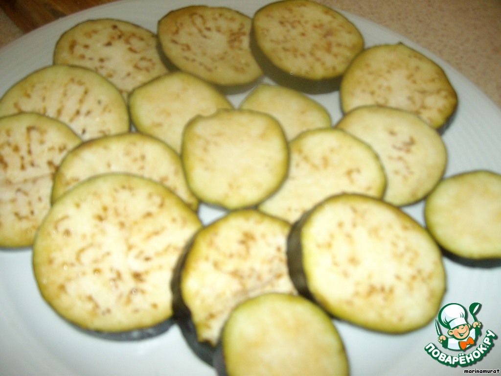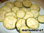 Баклажаны нарезаем на кружочки и посыпаем солью. Оставляем на некоторое время. |
