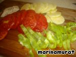 Нарезаем кружочками цуккини, помидоры, перец - на длинные полоски. |