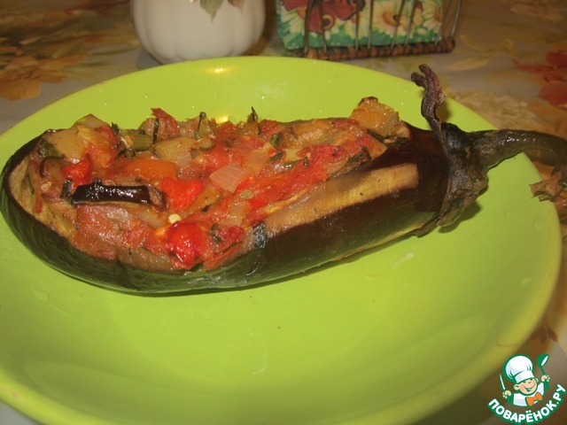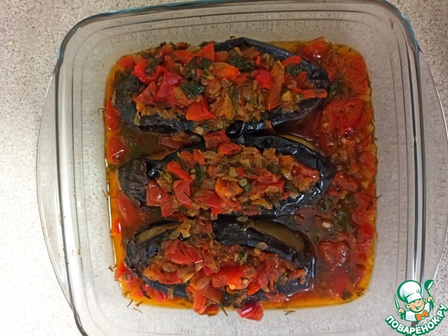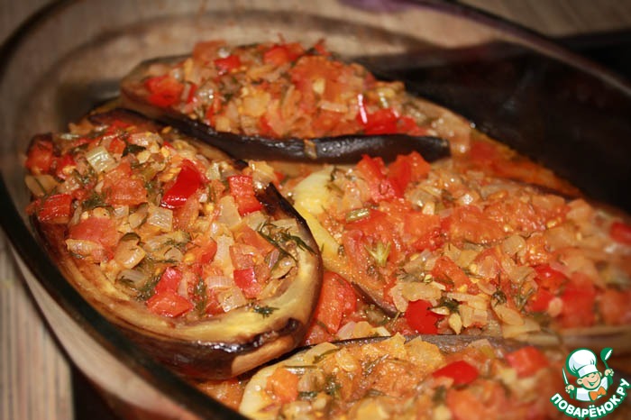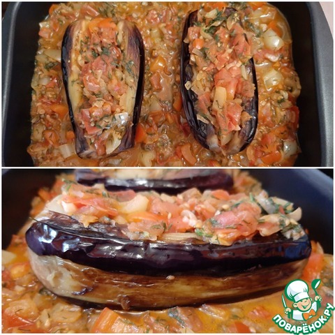 В карманы баклажан закладываем половину начинки. На дно жаропрочной посуды выкладываем вторую половину начинки, сверху фаршированные баклажаны, накрываем крышкой или фольгой и ставим в разогретую до 180 градусов духовку минут на 30-40.