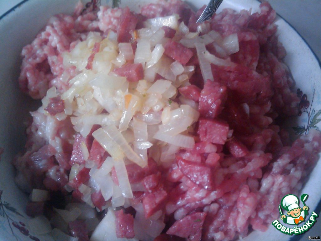 Колбасу порубить и обжарить с оставшимся луком и чесноком. Добавить к фаршу.