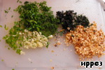 Порубить очень мелко ножом зелень, чеснок и орехи.