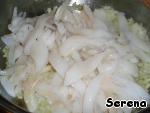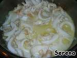 Помыть и почистить каракатицы: снять плёнку (если они мелкие, то можно только сполоснуть), вытащить из мешка внутренности, убрать глаза и жёсткие части тела. Этот процесс не фотографировала, не было помощников.