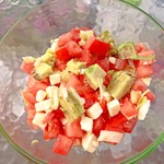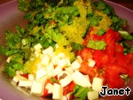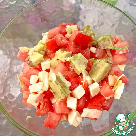 Авокадо очистить, вытащить косточку, нарезать кубиком.