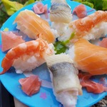 берем в ладонь рис (сколько сможем взять), сжимаем в плотный комок. На каждый кладем сверху щепотку хрена и накрываем кусочком приготовленной заранее рыбы или креветкой.