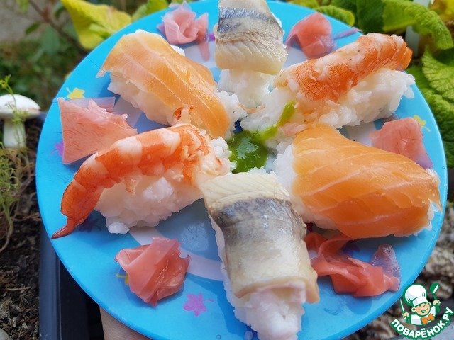 Суши — это рисовые котлетки, покрытые сверху кусочком сырой рыбы или сырой креветкой и пропитанные (приправленные) своеобразным соусом. За фото к рецепту спасибо Юлии yuvl.