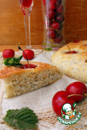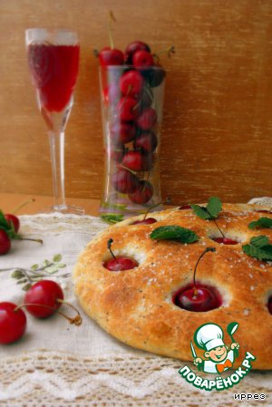 Выложить на лепешку черешню, вдавить в тесто, сбрызнуть (смазать) оливковым маслом, посыпать крупной солью, можно маком.