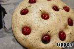Выложить на лепешку черешню, вдавить в тесто, сбрызнуть (смазать) оливковым маслом, посыпать крупной солью, можно маком.