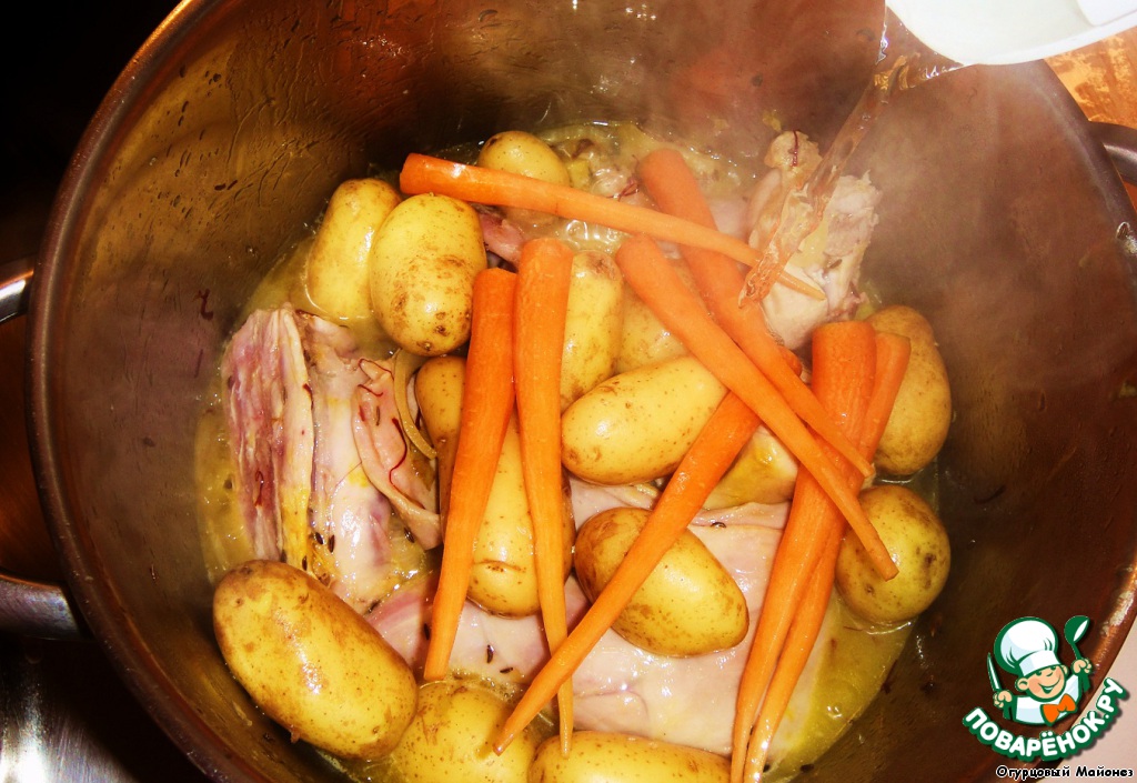 А тут, гарнир готовится вместе с основным. Кролик с картошкой и морковью.