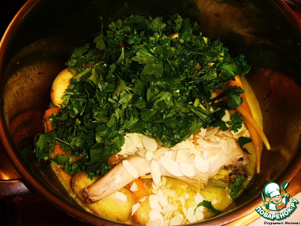 Через 20 минут добавляем тёртый миндаль и нарубленные крупно петрушку и кинзу. Тушим ещё 10 минут.