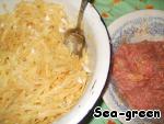 В фарш добавить немного натертого на мелкой терке сыра, поперчить и слегка посолить. -
