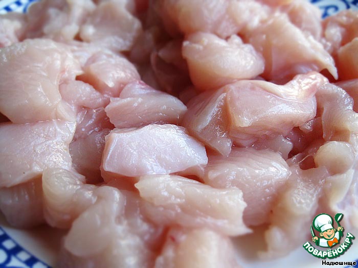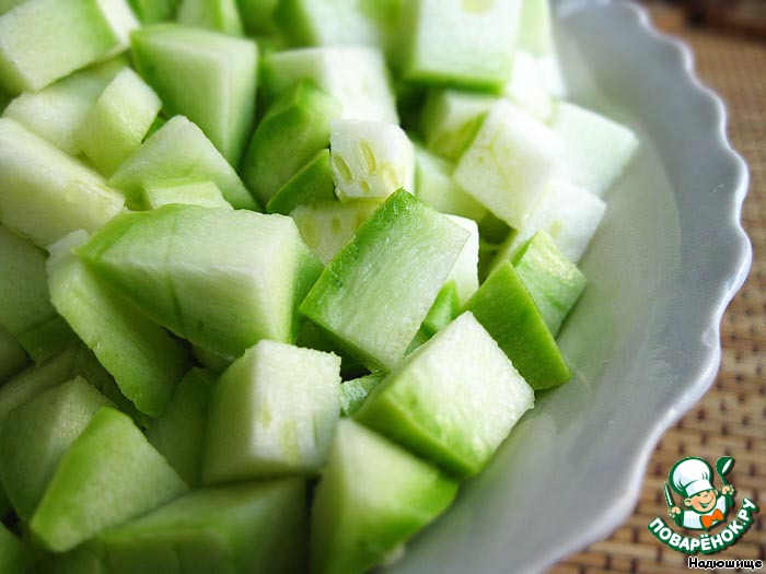 Кабачок нарезаем мелкими кубиками и добавляем к мясу тогда, когда оно будет наполовину готово.