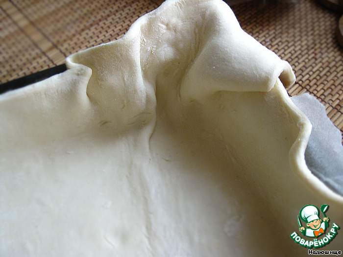 Форму выстилаем бумагой или фольгой для запекания и смазываем поверхность маслом. Слегка раскатываем слоеное тесто, кладем его в форму так, чтобы сверху были края с запасом.