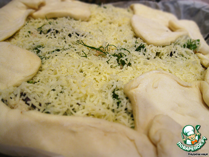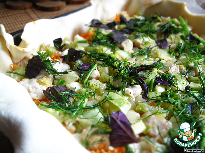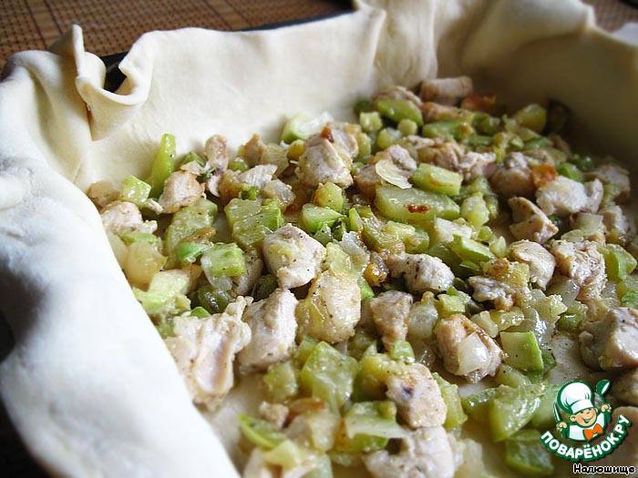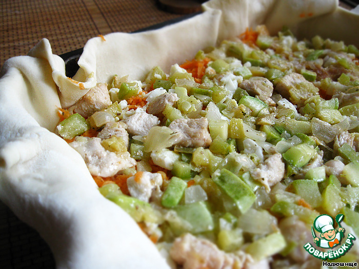 Приготовленную смесь овощей с мясом выкладываем на дно формы с тестом.
