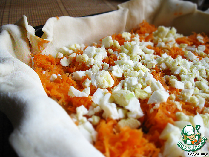 Следующим слоем положить тертую на мелкой терке морковочку,