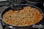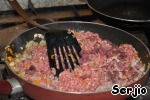 в фарш добавляем мелконарезанные птичьи потроха (сердечки, печень) и обжариваем, помешивая время от времени. -