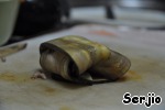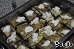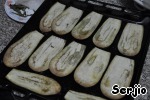Баклажаны при покупке лучше выбирать подлиннее и поуже, это облегчит их заворачивание. Разрезаем их на тонкие полоски и выкладываем на смазанный маслом противень. Запекаем при 180 град. 5 мин. (до мягкости), примерно вот так: -